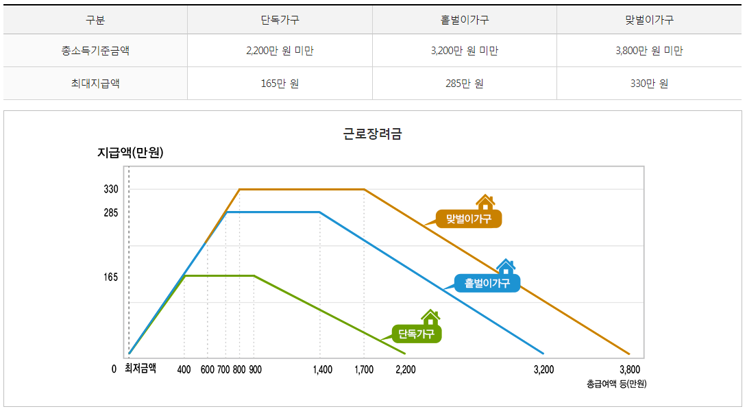 근로장려금 : 단독가구 2,200만원, 홑벌이가구 3,200만원, 맞벌이가구 3,800만원