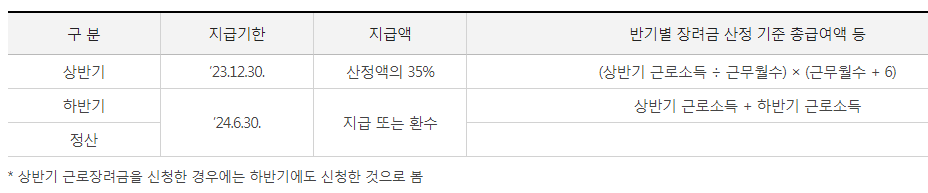 상반기분 근로장려금은 ’22년도 가구 · 소득 · 재산요건에 따라 12월에 먼저 지급하고, ’24년 6월에 ’23년도의 가구 · 소득 · 재산요건으로 정산하여 추가 환급하거나 환수합니다.
