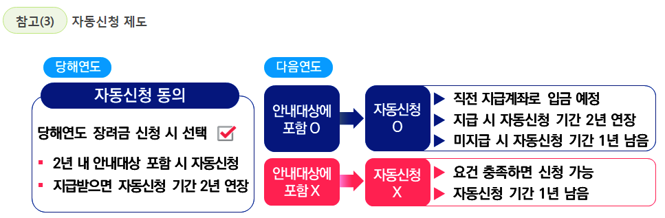 [자동신청 제도]: 60세이상 고령자 및 중증장애인이 장려금 신청기간에 동의하면, 향후 2년 내 신청안내 대상 포함 시 자동으로 신청