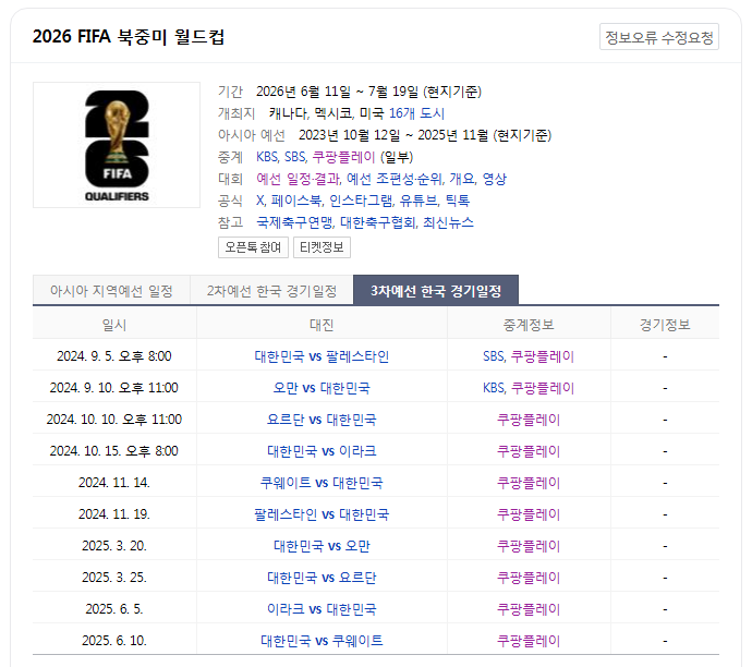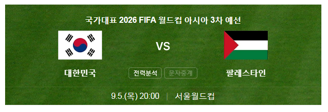 드디어 2024년 9월 5일 목요일 밤 8시 서울 월드컵 경기장에서 국가대표 2026 FIFA 월드컵 아시아 3차 예선 우리나라와 팔레스타인 경기가 진행됩니다. 9월 10일에는 우리나라와 오만과의 경기가 9월 10일 화요일 23시 술탄카부스 경기장에서 이루어 집니다.