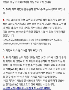 반응형 IP682 갤럭시s8,갤럭시s8플러스 붉은액정 화면 최적화 공지, 소프트웨어 업데이트까지... 삼성멤버스에 들어가보니, 디스플레이 색상 최적화 메뉴 사용에 대한 안내를 공지사항으로 띄웠네요... 결국 그러한 특성이 있을 수 있으니, 조절하여 사용하라는 거네요. 하지만 맨아래 보면, 혹시라도 사용에 불편함을 느끼시는 분은 가까운 삼성서비스센터를 방문하시어 조치를 받으시라고 안내가 되어져 있습니다... 어떤 AS처리를 해주는지 궁금하지만...다행히.. 제 제품은 문제가 없어서 참 다행이라는 생각입니다. 이전에 제가 올린 영상과 글도 확인해보세요. 영상 확인해보세요~! 갤럭시 s8 plus 일반인 개봉기-1 https://youtu.be/_8F72CCLdb0 갤럭시 s8 plus 일반인 개봉기-2 https://youtu.be/cf18GG7M-40 갤럭시 s8, s8플러스 붉은액정 이슈 논란, 오줌액정.. 2017. 4. 20. 갤럭시 s8, s8플러스 붉은액정 이슈 논란, 오줌액정? 영상 확인해보세요~! 갤럭시 s8 plus 일반인 개봉기-1 https://youtu.be/_8F72CCLdb0 갤럭시 s8 plus 일반인 개봉기-2 https://youtu.be/cf18GG7M-40 아래 사진의 좌측이 회사동료꺼, 우측이 내꺼... 회사동료는 결국 두번이나 삼성as센터를 방문하여 두번째 방문시 진상까지 떨어서 겨우 불량품확인서를 받아냈습니다.. 처음에는 인터넷을 보고 회사동료도 이런 현상이 있다는 것을 알게되었고 바로 as센터에 갔는데 폰8대를 놓고 비교 결과 동료의 것은 붉은 기운이 다른것에 비해 중간정도의 븕은 기운이 있다는 것을 확인하게 되었고 교품처리를 원했으나 이정도는 교품에 해당되지 않는다는 말에 돌아왔어야 했습니다. 당일 사전예약한 제 폰이 도착하였고 개봉기 촬영과 함께.. 2017. 4. 15. 이전 1 다음 반응형